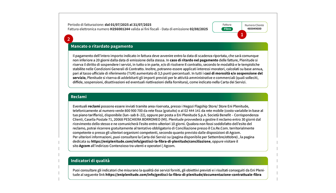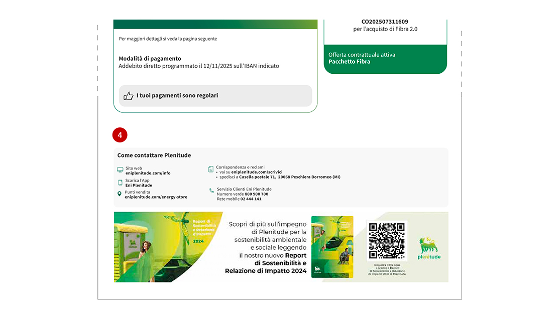 3. Subito sotto sono riportati il periodo di fatturazione, il numero della fattura e la data di emissione. Per il pagamento delle bollette, Plenitude mette a disposizione diversi metodi, dalla domiciliazione al pagamento online con carta di credito. Nel caso in cui siano presenti importi a credito, questi vengono indicati nella sezione dedicata ai consumi. Per motivi contabili, l’importo della fattura viene azzerato. Il credito può essere utilizzato per saldare le fatture successive, compensare eventuali fatture non pagate oppure, in caso di cessazione della fornitura o su richiesta del cliente, essere rimborsato. Viene inoltre indicato se i tuoi pagamenti risultano regolari e lo stato della tua offerta.